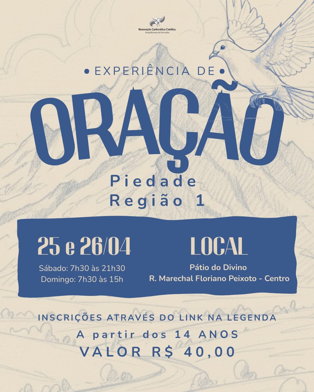Está chegando o Retiro " Experiência de oração". Nos dias 25 e 26 de Abril de 2026, você viverá um momento único de encontro pessoal com Jesus: uma experiência profunda e íntima com Deus.