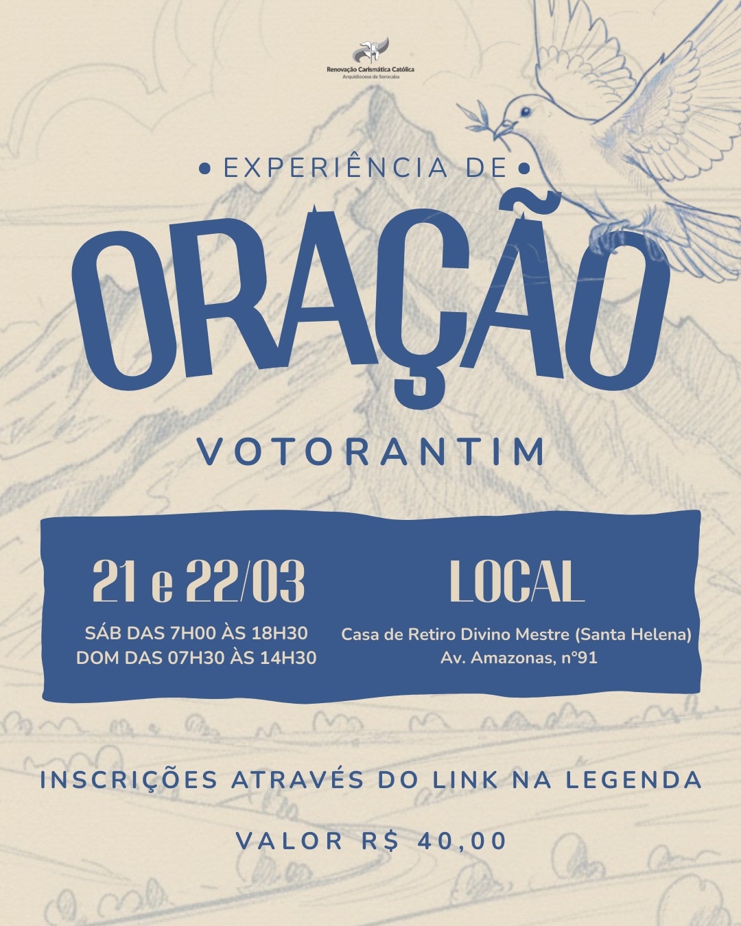 Está chegando o Retiro " Experiência de oração". Nos dias 21 e 22 de março de 2026, você viverá um momento único de encontro pessoal com Jesus: uma experiência profunda e íntima com Deus.