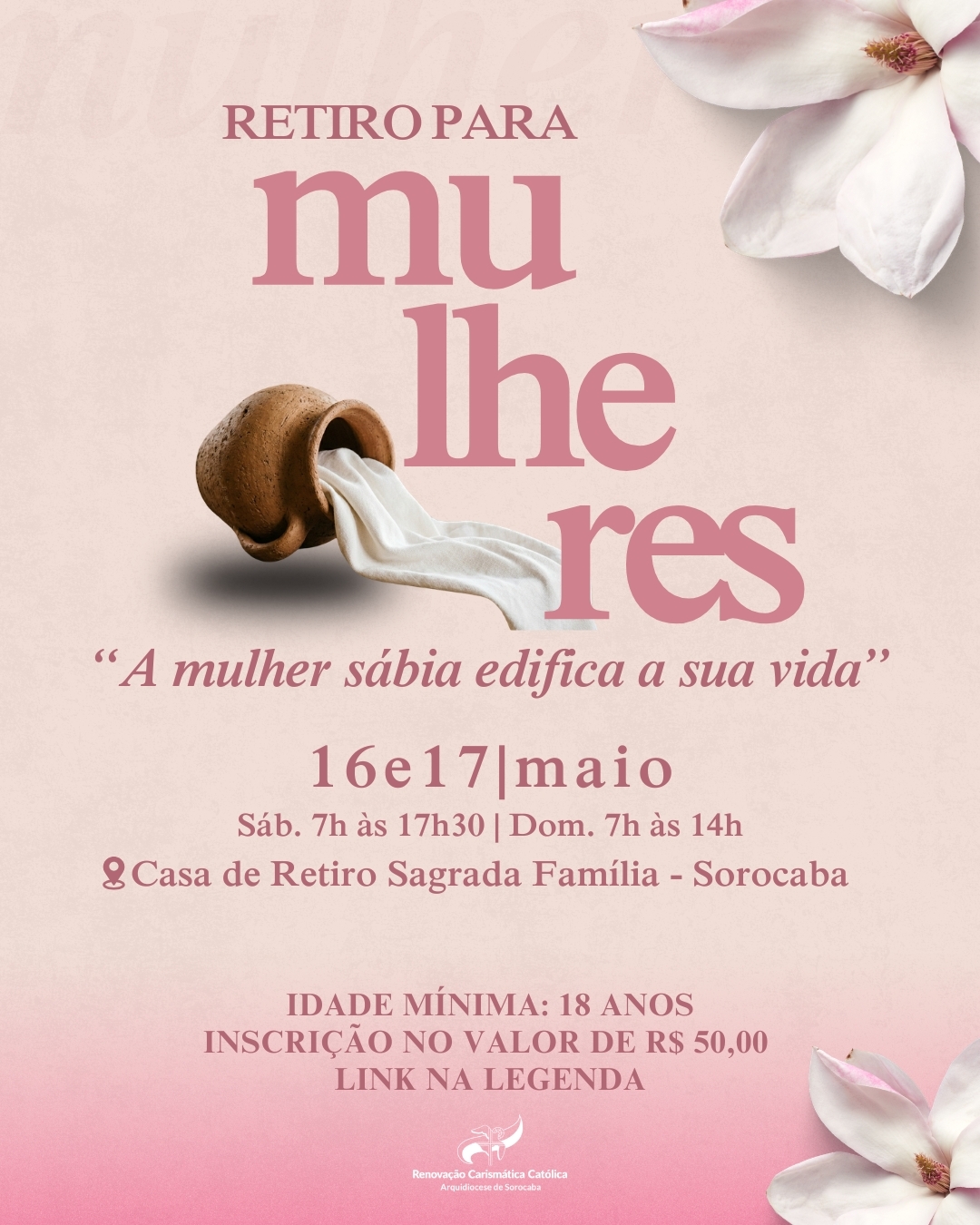 Se aproxima em nossa arquidiocese o retiro para Mulheres nos dias 16 e 17 de maio de 2026, um momento de profundo encontro com Deus e uma oportunidade de sermos geradas Nele.